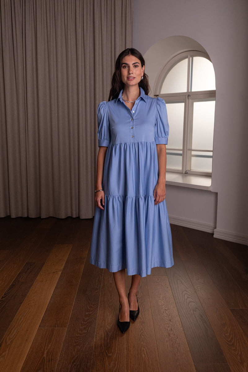 Short-sleeved cotton blend dress with puff sleeves, Sky