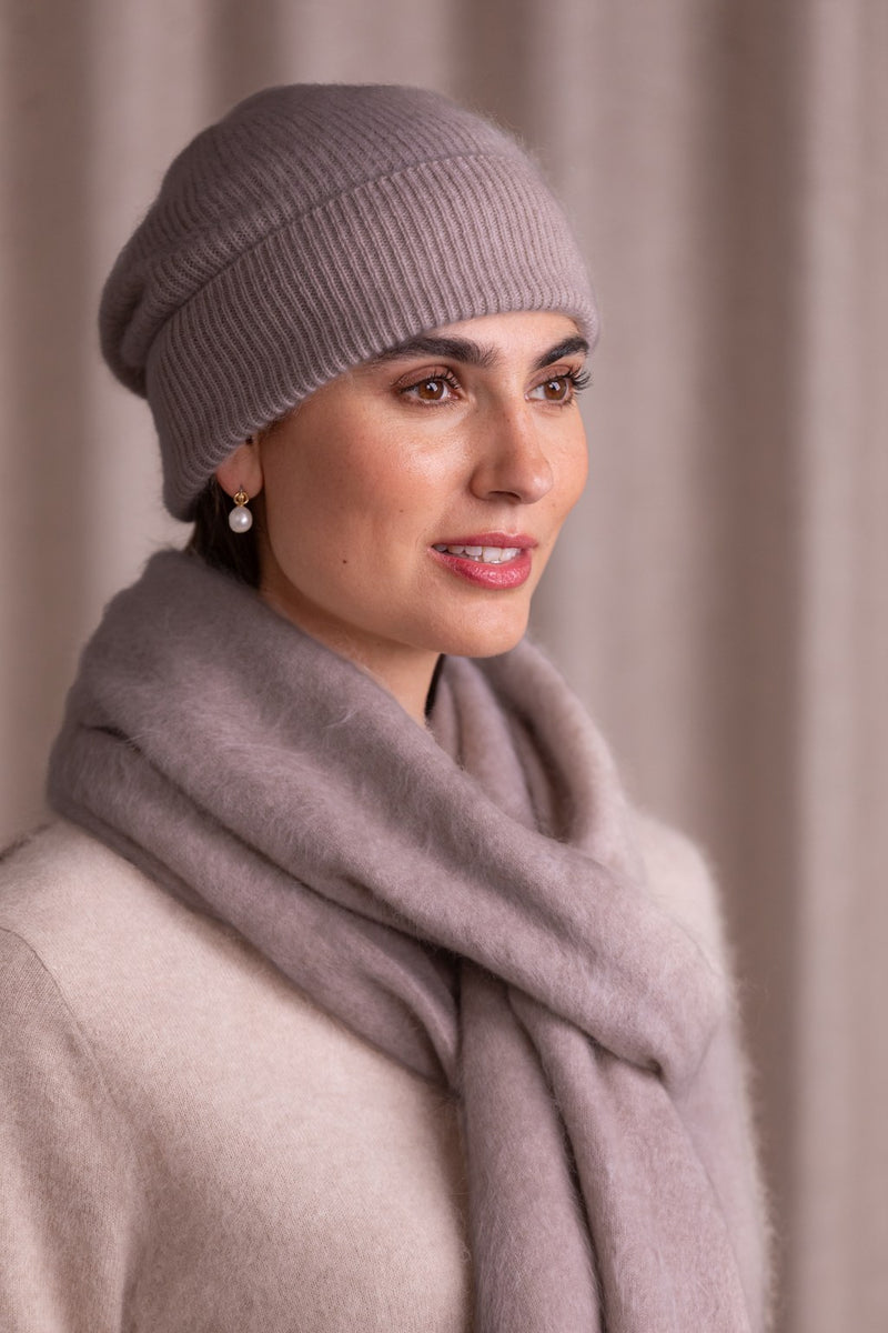 Tämä joustinneulospintainen Kara-pipo on valmistettu erityisen pehmeästä harjatusta kashmirista ja siinä on leveä käänne. Kashmirpipon korkeutta voi säätää helposti käänteen leveyttä muuttamalla.