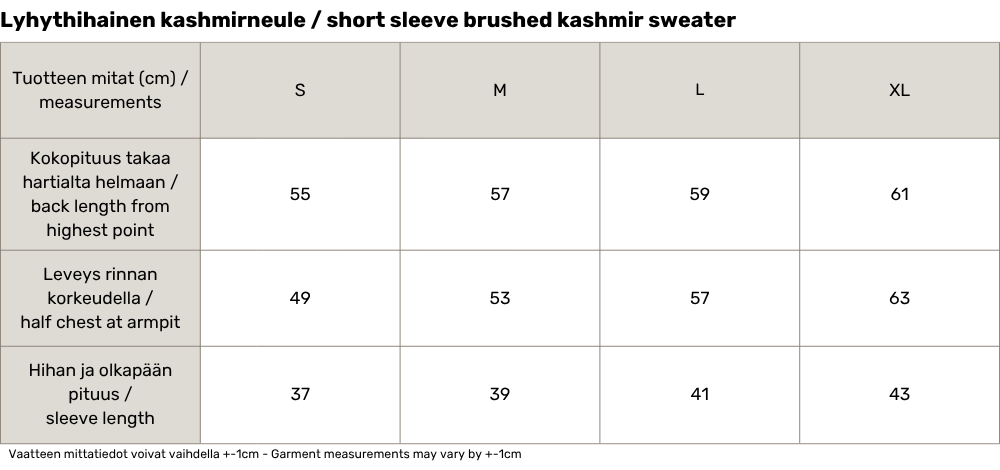Lyhythihaisessa Karlie-kashmirneuleessa kohtaavat pehmeys ja ajaton tyyli. Klassinen O-pääntie, raglanhihojen istuvuus ja suora leikkaus mukautuvat monen kokoisille ja -muotoisille vartaloille. Kapeat käänteet hihansuissa ja helmassa viimeistelevät huolitellun ilmeen. Neule on valmistettu 100 % kashmirista, jonka harjattu pinta tuntuu erityisen miellyttävältä ihoa vasten. Tämä monipuolinen neule sopii täydellisesti niin arkeen kuin juhlavampiin tilanteisiin, tuoden vaatekaappiisi mukavuutta ja pehmeää eleganssia.