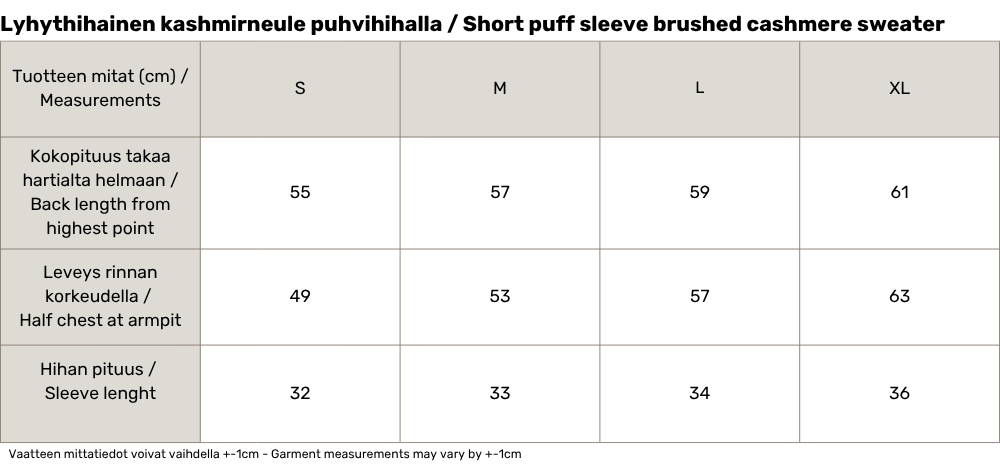 Pehmeä lyhythihainen Karli-kashmirneule on klassinen O-kaula-aukko ja istutettu hihalinja, jota korostavat kevyet puhvihihat ja olkapäillä kauniit laskostukset. Suora, kevyesti vartaloa myötäilevä malli luo rennon mutta huolitellun siluetin. Hihansuissa leveä ribbineulos tuo ryhtiä ilmeeseen, ja helmassa oleva neuloskäännös viimeistelee kokonaisuuden. Harjattu kashmirpinta tuntuu pehmeältä ihoa vasten. Tämä neule on sekä arjen että juhlan luottovaate.