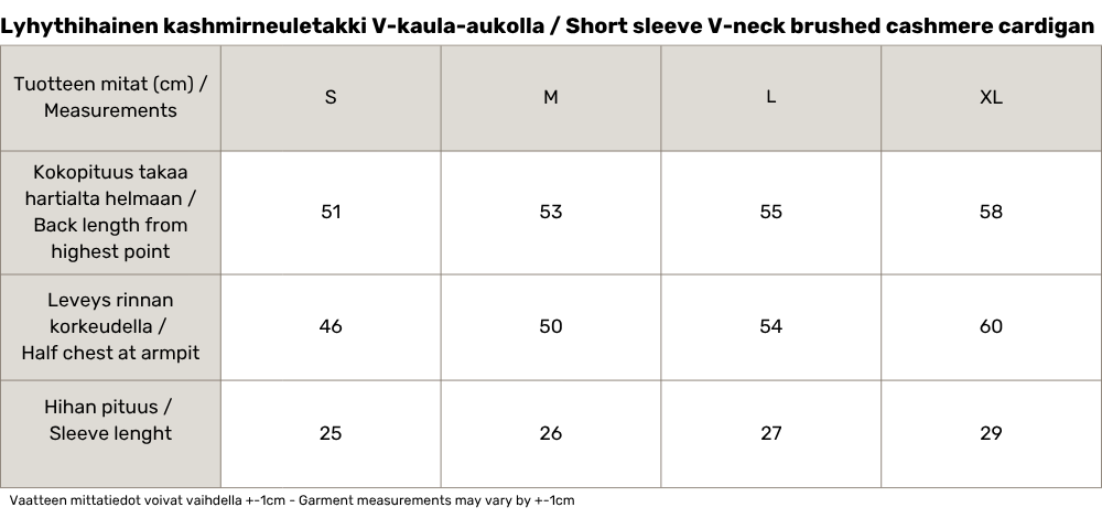 Lyhythihainen Karlian-kashmirneuletakki on pehmeä ja miellyttävä päällä, ja sen klassinen muotoilu tekee siitä monikäyttöisen vaatekaapin perusosan. Istutettu hihalinja luo ryhdikkään, jakkumaisen siluetin, ja hihansuissa sekä helmassa olevat kapeat neuloskäännökset luovat huolitellun vaikutelman. Avara V-kaula-aukko tekee neuletakista ilmavan ja kevyen, jolloin sitä on helppo yhdistää niin arkipukeutumiseen kuin juhlavampiin asukokonaisuuksiin.
