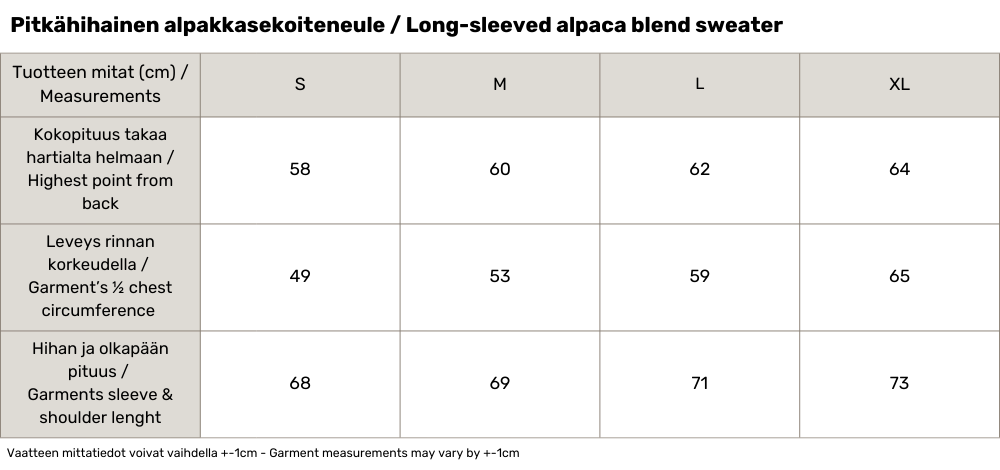 - Ennen kuin otat neuleen käyttöön, suosittelemme sen höyryttämistä höyryttimellä tai höyrysilitysraudalla, jotta neuleesta tulee pehmeä ja ilmava. Harjaa neule tämän jälkeen tasolla myötäkarvaan vaateharjalla, mikä auttaa pitämään pinnan huoliteltuna. Säännöllinen harjaus ja tuuletus raikastavat neuletta ja vähentävät pesutarvetta. Jos pesu on tarpeen, suositamme kuivapesua tai hellää käsinpesua luonnonkuiduille sopivalla pesuaineella. Säilytä neule viikattuna, jotta se säilyy kauniina pitkään.